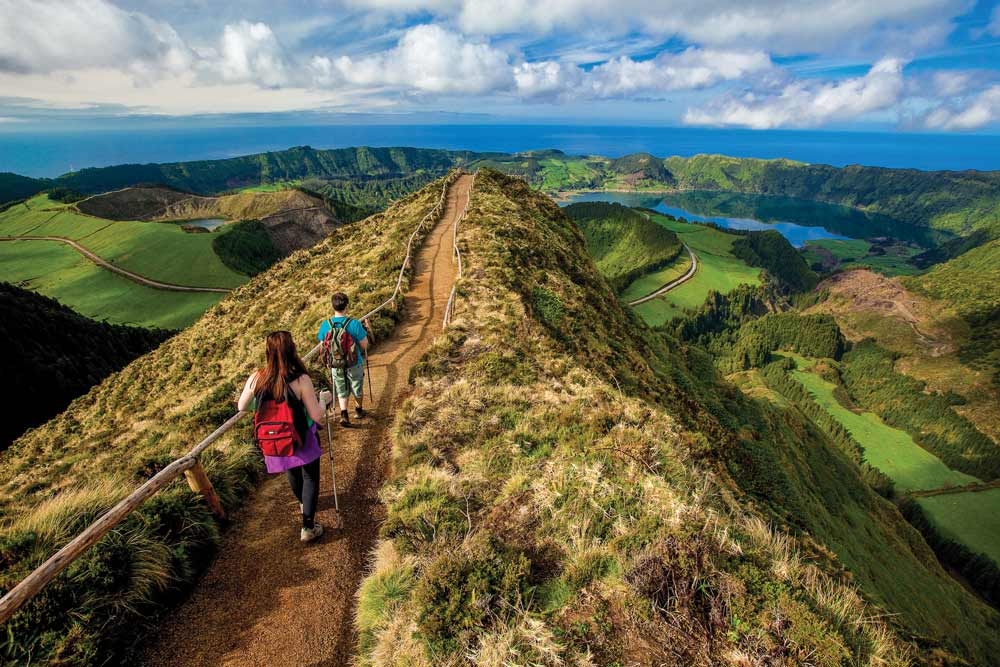 Active highlight: One of the best hiking routes in the Azores is the Sete Cidades crater rim trail on São Miguel. The route follows the edge of a vast volcanic caldera overlooking twin lakes – one emerald green, the other deep blue – with sweeping views across the Atlantic.